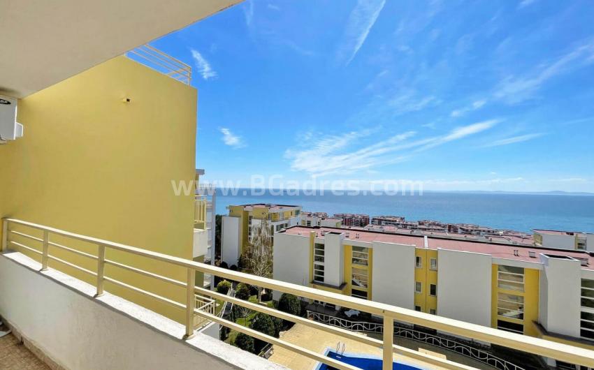 Apartment mit atemberaubendem Meerblick im Fort Noks Grand Resort-Komplex, Sveti Vlas. Der Komplex liegt in einer malerischen Gegend zwischen Meer und Bergen. Auf dem Territorium gibt es 17 Schwimmbäder, Spielplätze, Wasserrutschen, Restaurants, Cafés, einen Kinderclub, einen Supermarkt, einen Minigolfplatz, einen Tennisplatz, Parkplätze, einen Sicherheitsdienst und eine Rezeption.